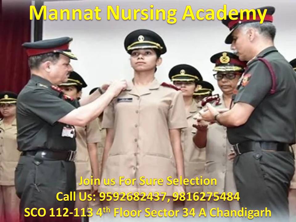 Mannat Nursing Academy Chandigarh Prepare the Medical students for Military Nursing services (Nursing) Course. Joining the Army gives an opportunity for nurses to serve their country and support military families and their communities, both at home and on overseas deployment.We also enjoy a variety of job and financial benefits, making it an attractive alternative to civilian nursing if you are tempted by the military life. Some join an already established career in nursing, while others join the Preparation Corps of Reserve Officers as students before getting a degree from nursing college.