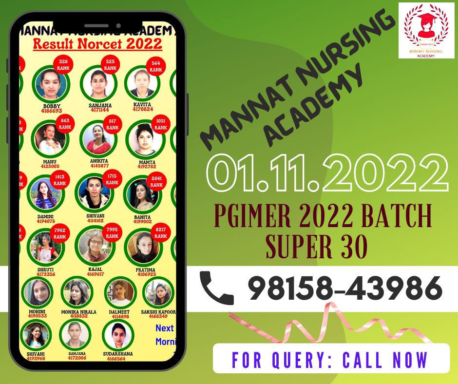 For Sure Success Join MANNAT NURSING ACADEMY CHANDIGARH.definitely you will crack the entrance exam PGIMER Released Nursing Posts. Register yourself for regular class room program